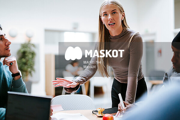 Kvinnlig student pratar med vänner