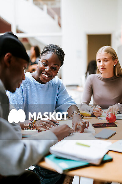 Glad kvinnlig student pluggar med vänner