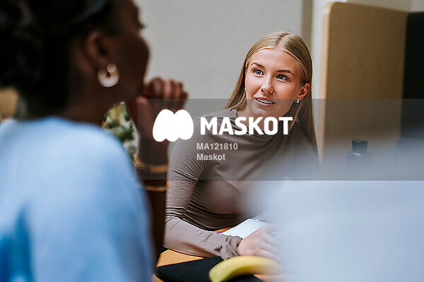 Kvinnlig student pluggar med vän på universitet