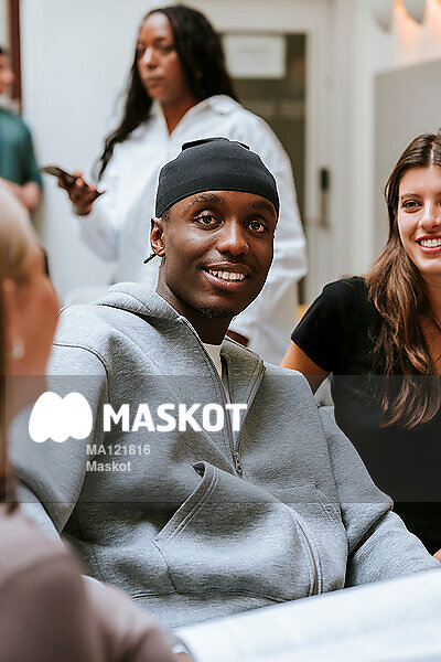 Porträtt av leende manlig student som sitter med vänner på universitet