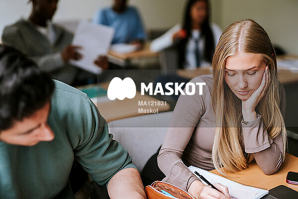 Kvinnlig student pluggar i lektionssal