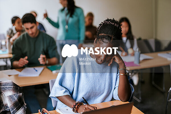 Kvinnlig student pluggar i lektionssal