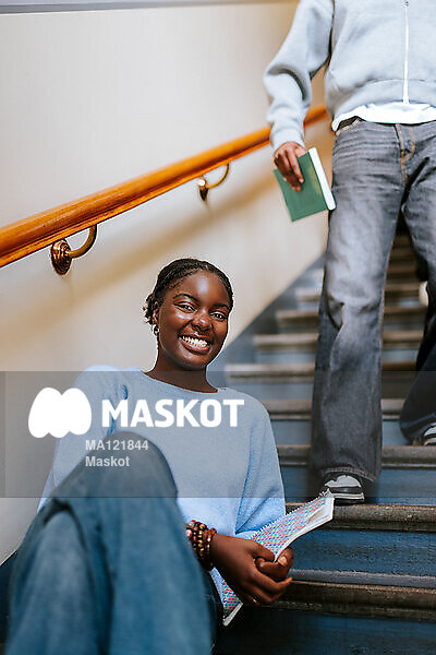 Porträtt av glad kvinnlig student som sitter i trappa