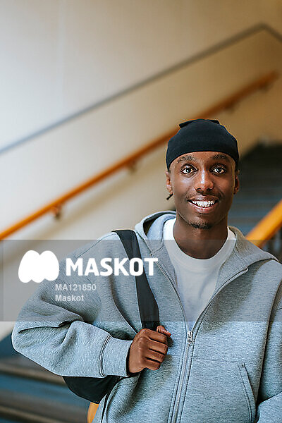 Porträtt av leende manlig student som sitter i trappa