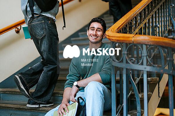 Porträtt av leende manlig student som sitter i trappa