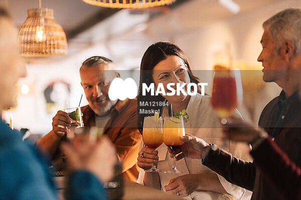 Glada vänner sitter i bar med cocktails