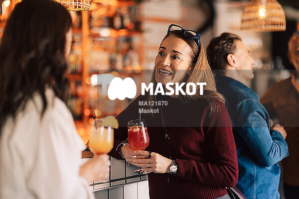 Kvinna som håller i cocktail pratar med vän