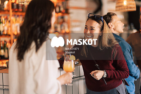 Glad kvinna pratar med vän i bar