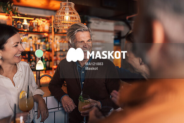 Glad man skrattar med vänner i bar
