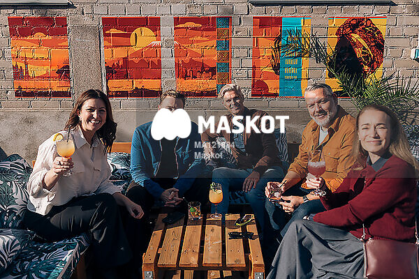 Porträtt av vängrupp som umgås vid uteservering