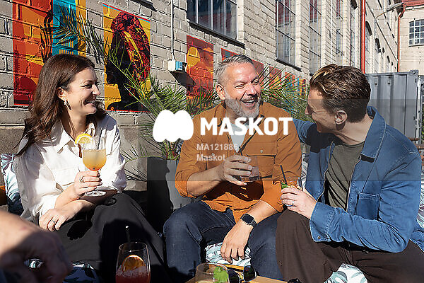 Glad man umgås med vänner på uteservering
