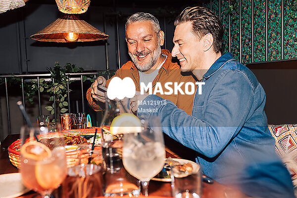 Glada män tar bild på mat med mobil