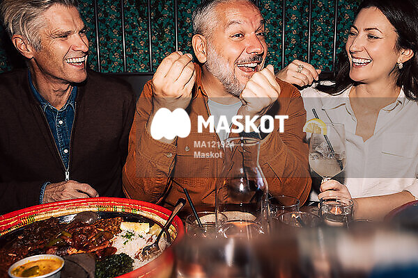 Glad man äter med vänner på resturang