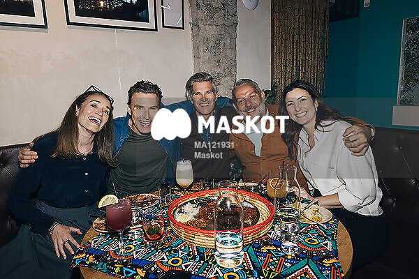 Porträtt av glada vänner som sitter på resturang