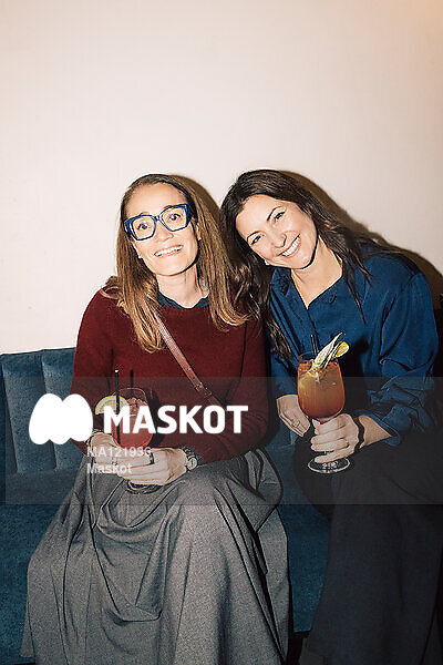 Porträtt av glada kvinnliga vänner som sitter med drinkar