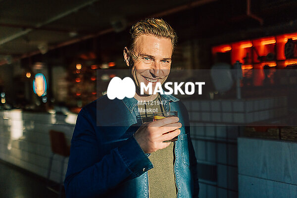 Porträtt av leende man som håller i drink i bar