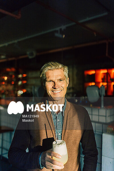 Porträtt av leende man som står i bar med drink