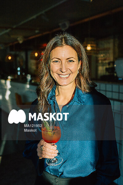 Porträtt av leende kvinna som håller i drink