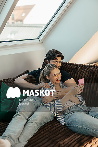 Ungt par umgås i soffa