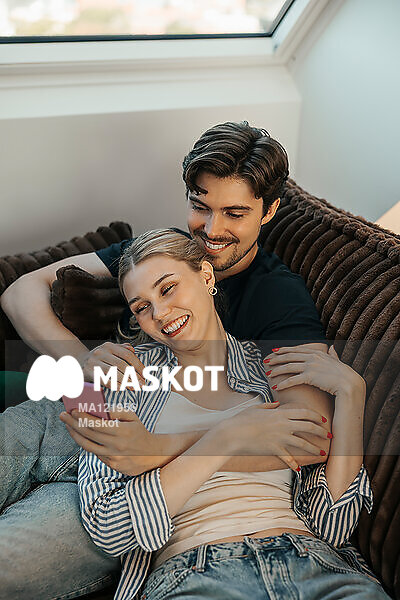Glad ung man umgås med flickvän i soffa