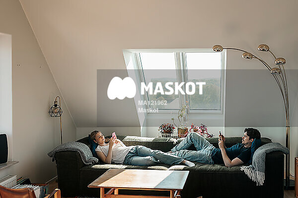 Ung man och kvinna kollar på mobil i soffa