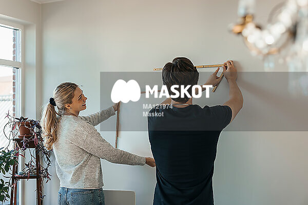 Ung man och kvinna mäter vägg