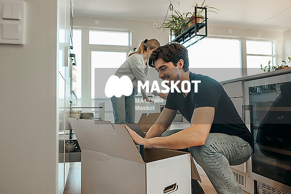 Glad ung man sitter vid flyttlåda i kök