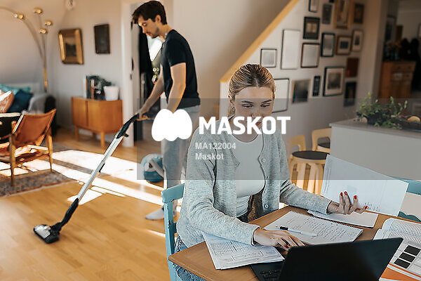 Ung kvinna pluggar medans pojkvän dammsuger