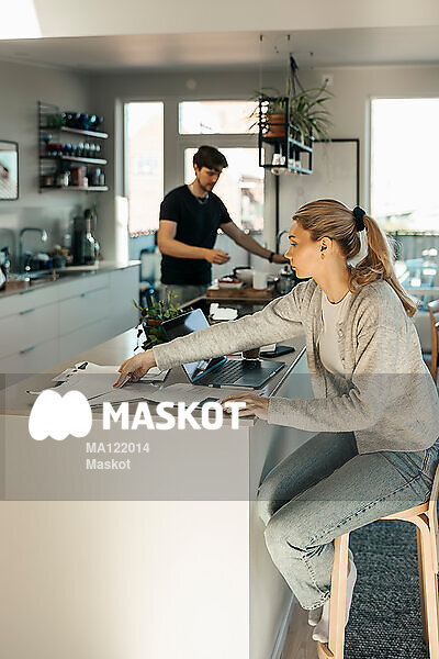 Ung kvinna pluggar vid köksö