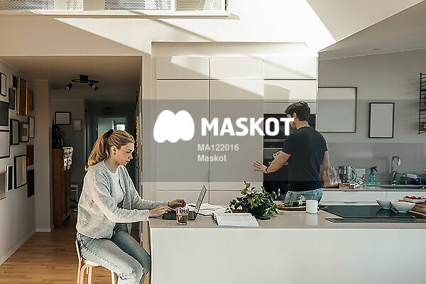 Ung kvinna hanterar räkningar vid köksö