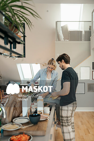 Ung man står vid flickvän som häller upp kaffe