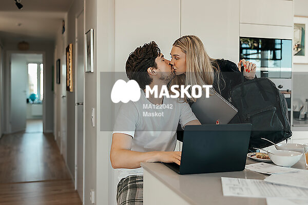 Ung kvinna pussar pojkvän i kök