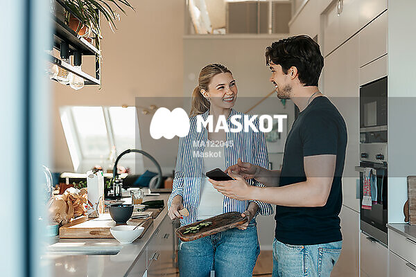 Glad ung kvinna ler mot pojkvän i kök