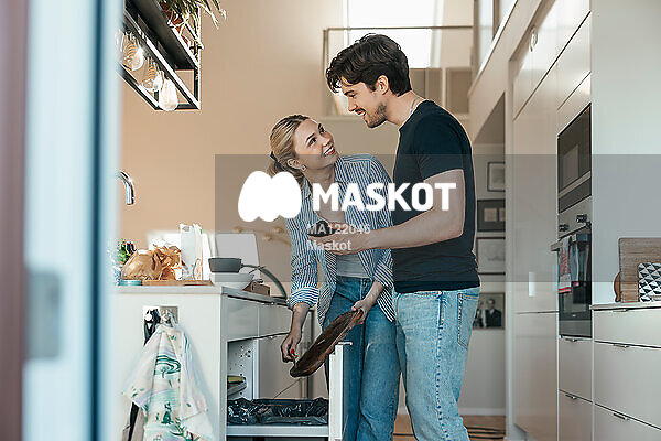 Ung man pratar med flickvän i kök