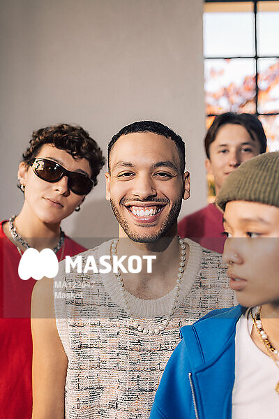 Porträtt av leende man som står med vänner