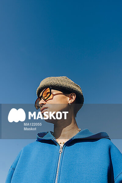Person med glasögon står i solen