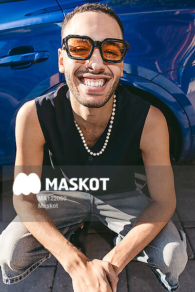 Porträtt av glad man med glasögon som sitter framför bil