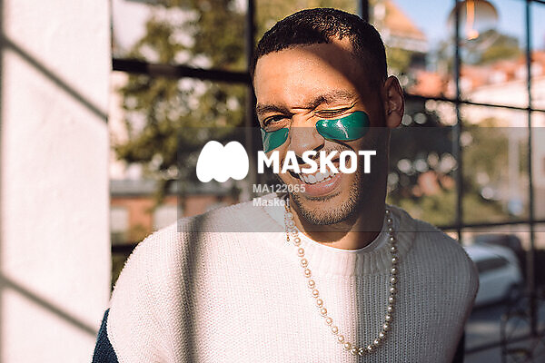 Porträtt av glad man med hudvårdsprodukt under ögonen