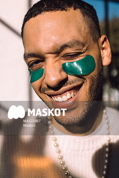 Porträtt av glad man med hudvårdsprodukt under ögon