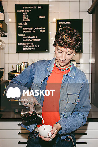 Kvinnlig barista häller mjölk i kopp