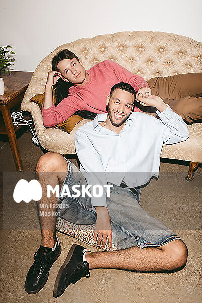 Porträtt av manliga vänner som håller hand i soffa