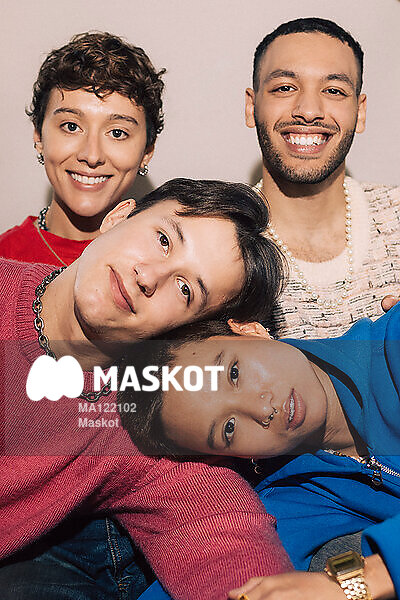 Porträtt av glada vänner som umgås