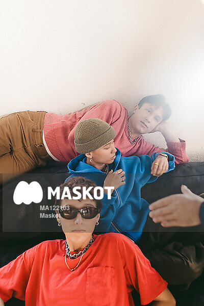 Vänner umgås vid soffa