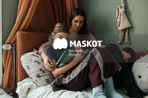 Mamma sitter med dotter i säng och läser