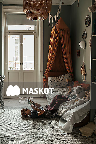 Ung flicka läser bok på golv i sovrum