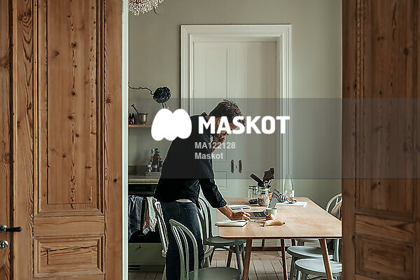 Man pratar i telefon och antecknar vid matbord