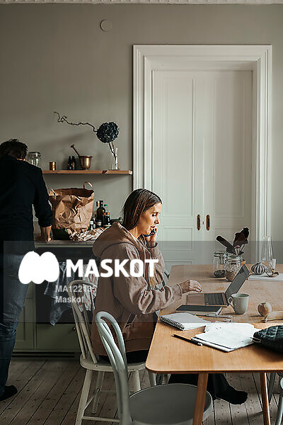 Kvinna pratar i telefon och skriver på dator vid matbord
