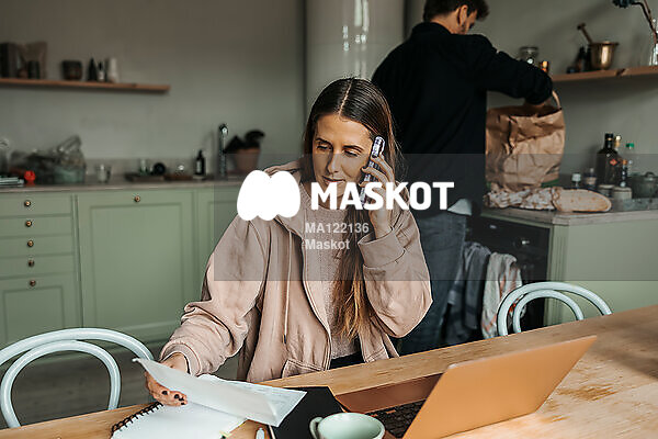 Kvinna pratar i telefon och kollar anteckningar vid matbord