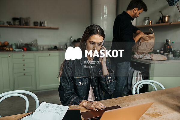 Kvinna pratar i telefon och använder dator vid matbord