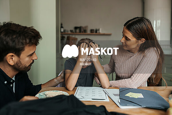 Föräldrar tröstar stressad dotter i kök